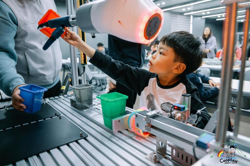 AGV小车动态体验环节备受萌娃喜爱。孩子们化身智慧物流小指挥官,在迷你工厂与仓库场景中,学习 AGV 小车感知环境、自主导航、动态避障的原理,亲手设定行驶站点、规划运输路线,协作解决小车运行中的小问题。在低速安全的演示模式下,孩子们有序操控、乘坐体验,直观理解智能物流与自动化技术,感受前沿科技带来的便捷与乐趣。